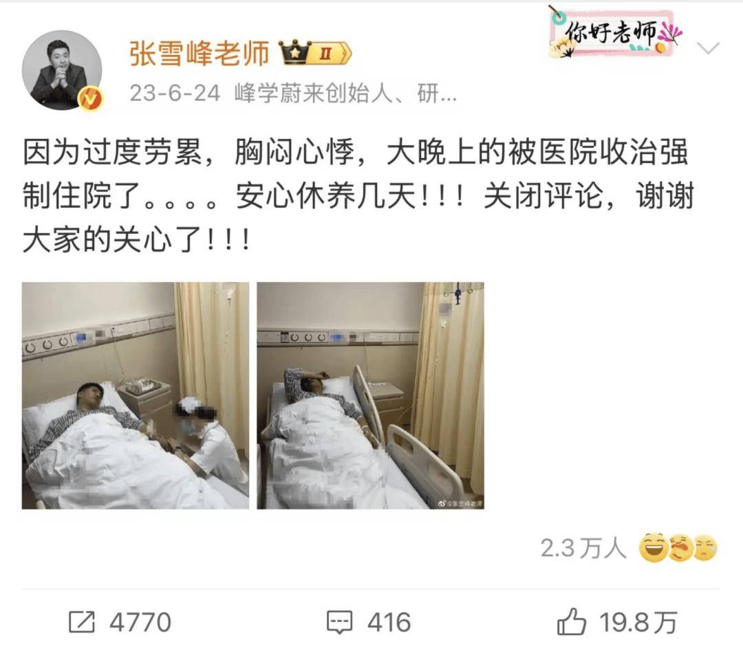 2023年6月,他就曾因过度劳累、胸闷心悸被医院强制收治住院。当时他在社交平台发文:“因过度劳累,胸闷心悸,晚上到医院急诊……被医院扣留,必须住院观察。”