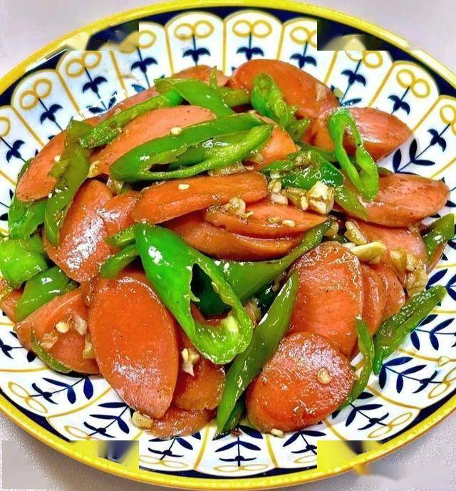 所需食材:青椒3个(约300克)、火腿肠2根、大蒜3瓣、生抽1勺、蚝油半勺、盐适量、白糖少许、食用油适量。