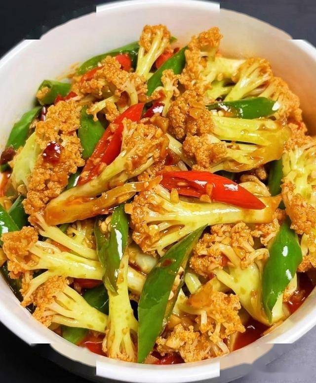 3. 大火快炒:加豆瓣酱、蒜片、干辣椒炒香后,倒入花菜大火翻炒,淋少许生抽调味。